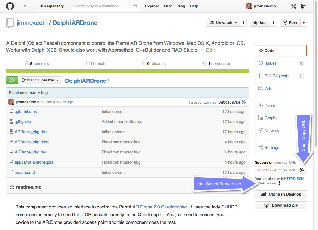 Sometimes it is nice to just open the project in your IDE of choice directly from GitHub. Turns out this is just as easy as 1-2-3. Right above the Clone in Desktop and Download ZIP buttons there is a checkout URL with support for Subversion. Simple click Subversion, then click copy URL and your can then open the GitHub project directly from the Delphi or RAD Studio IDE.