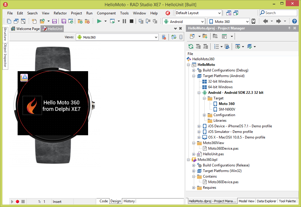 I really like my Moto 360 watch. It looks fabulous, and does great as an extension of my Android phone, but of course the most important question is how to make an app for it. Turns out it just works with RAD Studio X7, Delphi or C++. Thanks to the new FireUI Multi-Device designer I can actually create a custom view in the UI to make designing the perfect user interface a breeze. Here are some of the details of what I discovered along the way, followed by a download of my sample and the custom view.