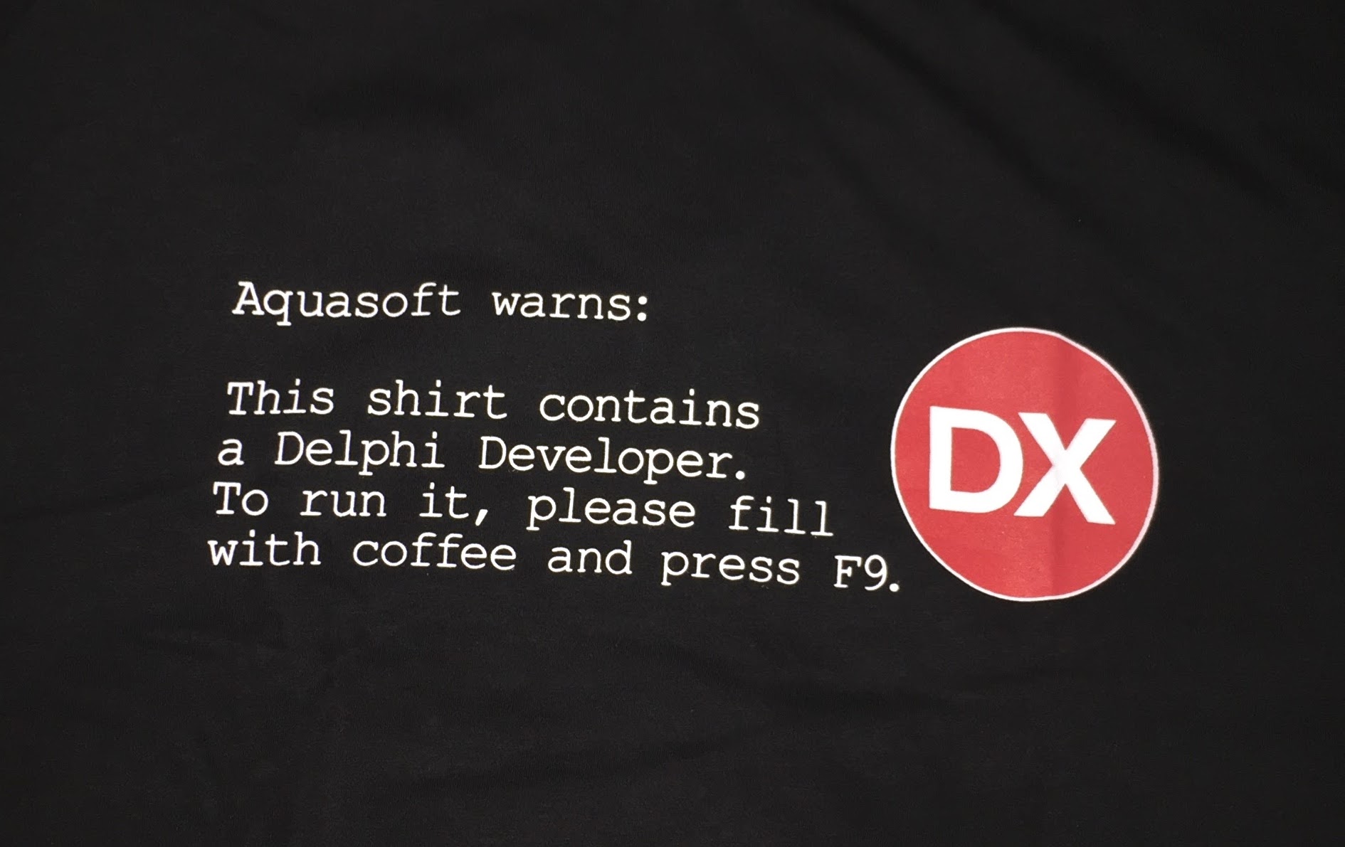 Aquasoft warns: This shirt contains a Delphi Developer. To run it, please fill with coffee and press F9.[/caption]