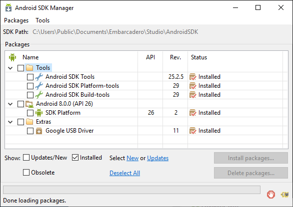 - Android SDK release 25.2.5 (this is the version RAD Studio installs, and the last version with the GUI)